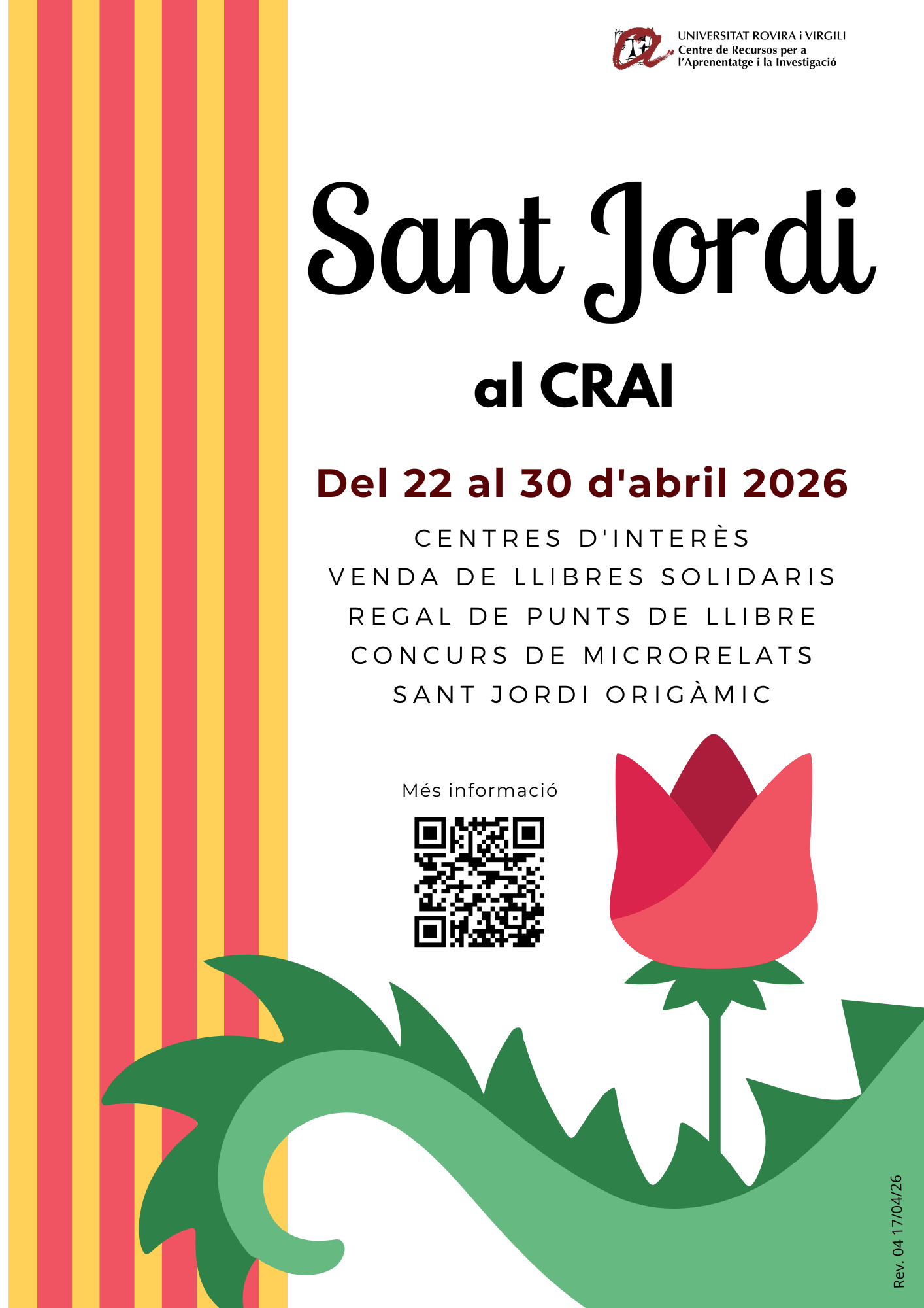 A més a més, us invitem a navegar per la guia virtual de Sant Jordi on trobareu totes les activitats del CRAI per Sant Jordi i els punts de llibre tematitzats per descarregar. A més a més, la guia consta de l'apartat "Sant Jordi alternatiu", amb recomanacions de llibres que donen una visió alternativa de la llegenda de Sant Jordi, i l'apartat "Sant Jordi creatiu", que inclou vídeo tutorials per crear manualitats de Sant Jordi molt enginyoses, proposades pel personal del CRAI. I enguany com a novetat inclou un nou apartat “Sant Jordi Internacional” on per exemple podeu consultar activitats que s’organitzen arreu del món en aquest dia tan especial.