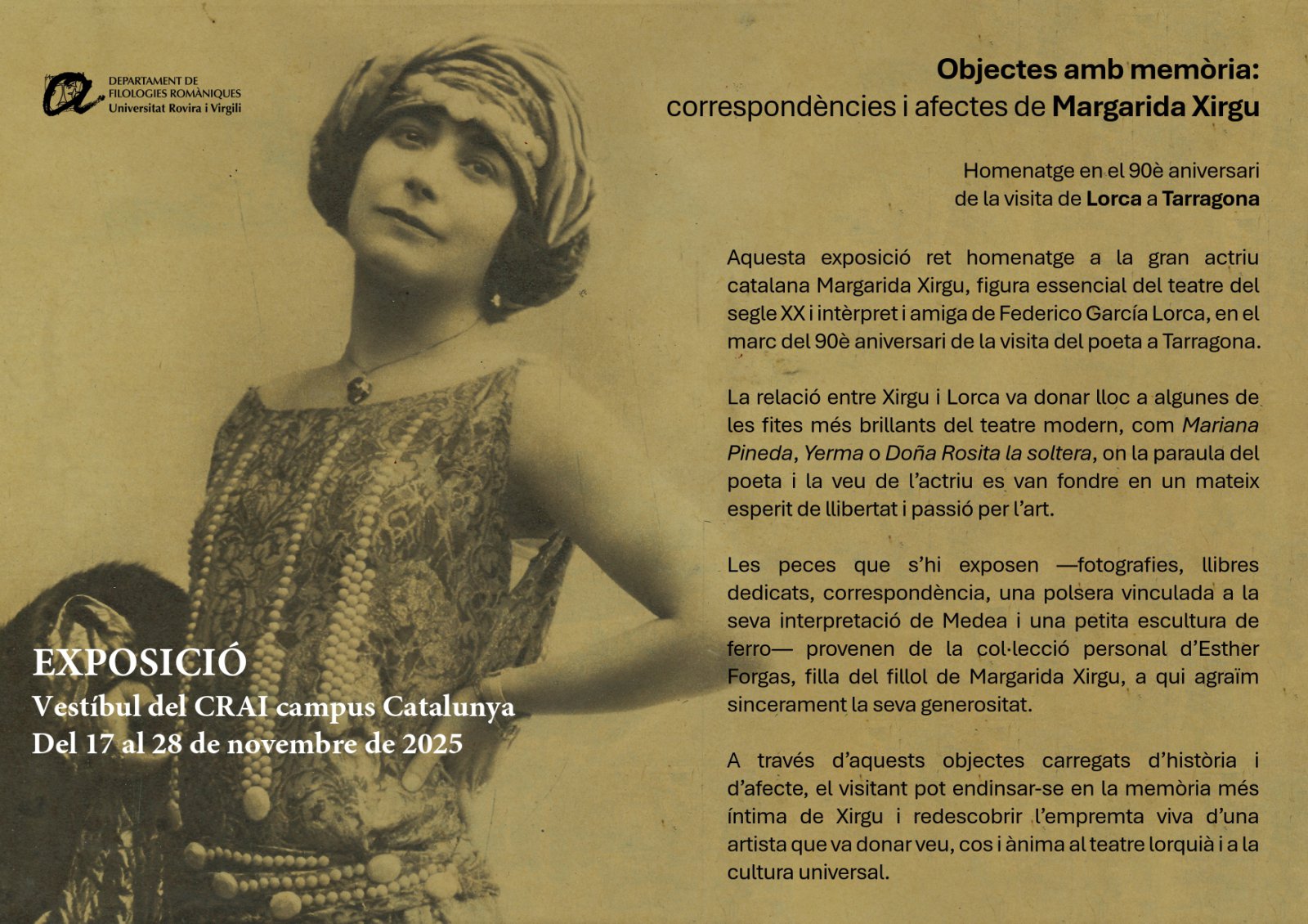 This exhibition pays tribute to the great Catalan actress Margarida Xirgu, an essential figure in 20th century theatre and interpreter and friend of Federico García Lorca, within the framework of the 90th anniversary of the poet's visit to Tarragona.