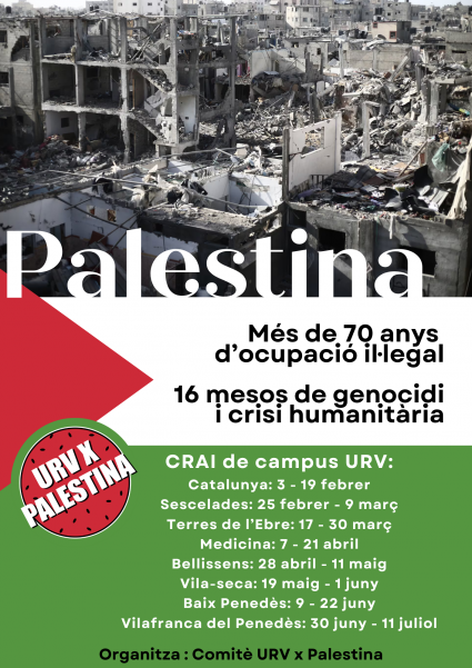El Comité URV x Palestina le invita a visitar la exposición "PALESTINA. Más de 70 años de ocupación ilegal y 16 meses de genocidio y crisis humanitaria" a partir del 30 de junio en el CRAI sede Vilafranca del Penedès.